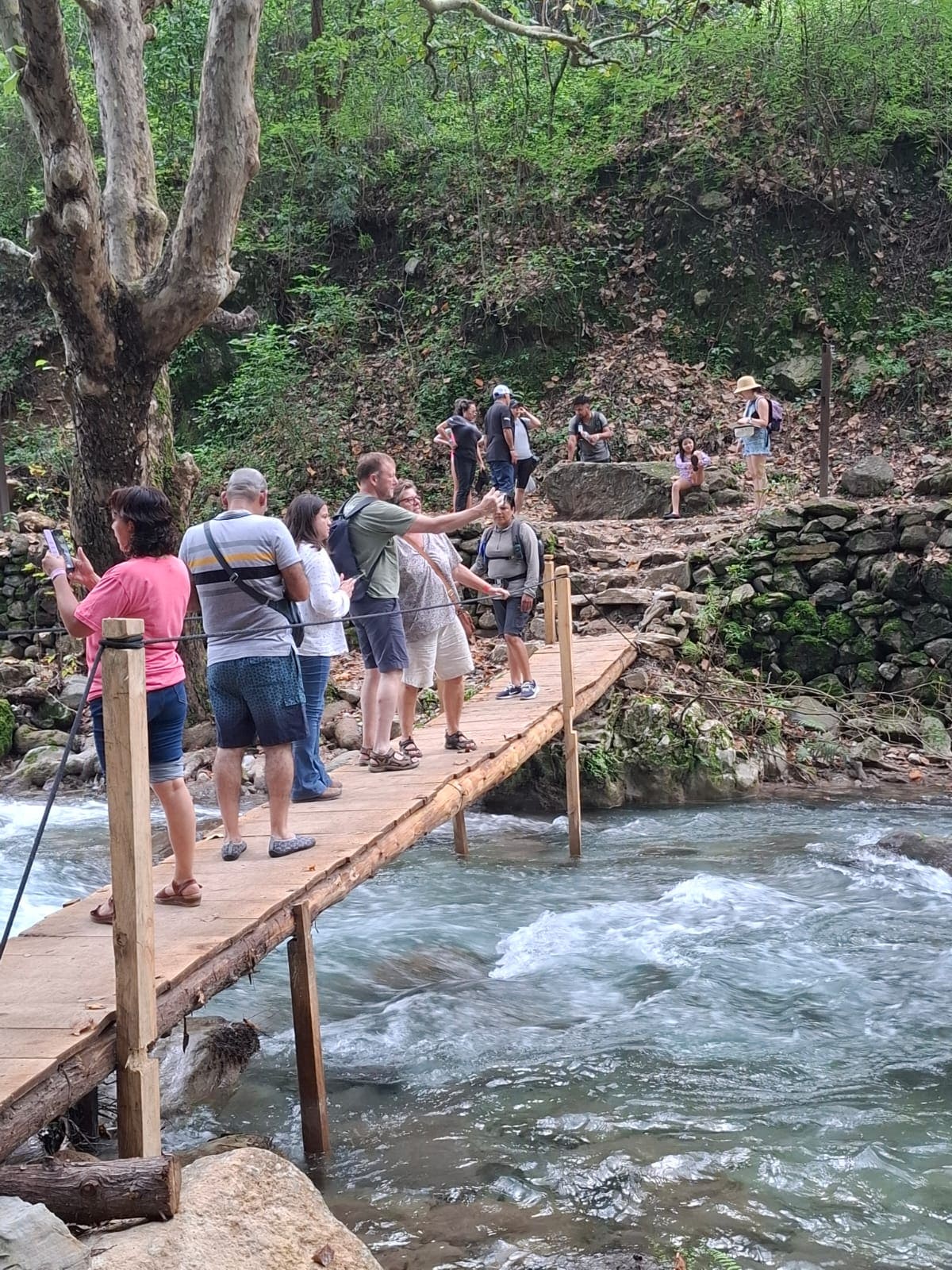Un pequeño grupo de viajeros avanza con paso firme sobre un estrecho puente de madera, rodeado por la exuberante vegetación de la Sierra Gorda Queretana. El murmullo del río acompaña su travesía hacia el místico Puente de Dios, un rincón escondido donde la naturaleza revela su magia. Cada paso es una promesa de aventura, conexión y asombro.